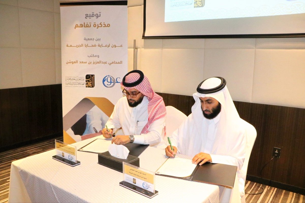 تم توقيع مذكرة تفاهم بين جمعية عون لرعاية ضحايا الجريمة مع مكتب المحامي عبدالعزيز بن سعد العوشن وقد مثّل الجمعية في التوقيع المدير التنفيذي أ. فهد بن محمد القحطاني ، كما مثل المكتب المدير العام المحامي عبدالعزيز بن سعد العوشن ، وتُعدُّ